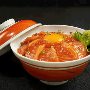 Cơm sò điệp phủ cá hồi ngâm xì dầu
